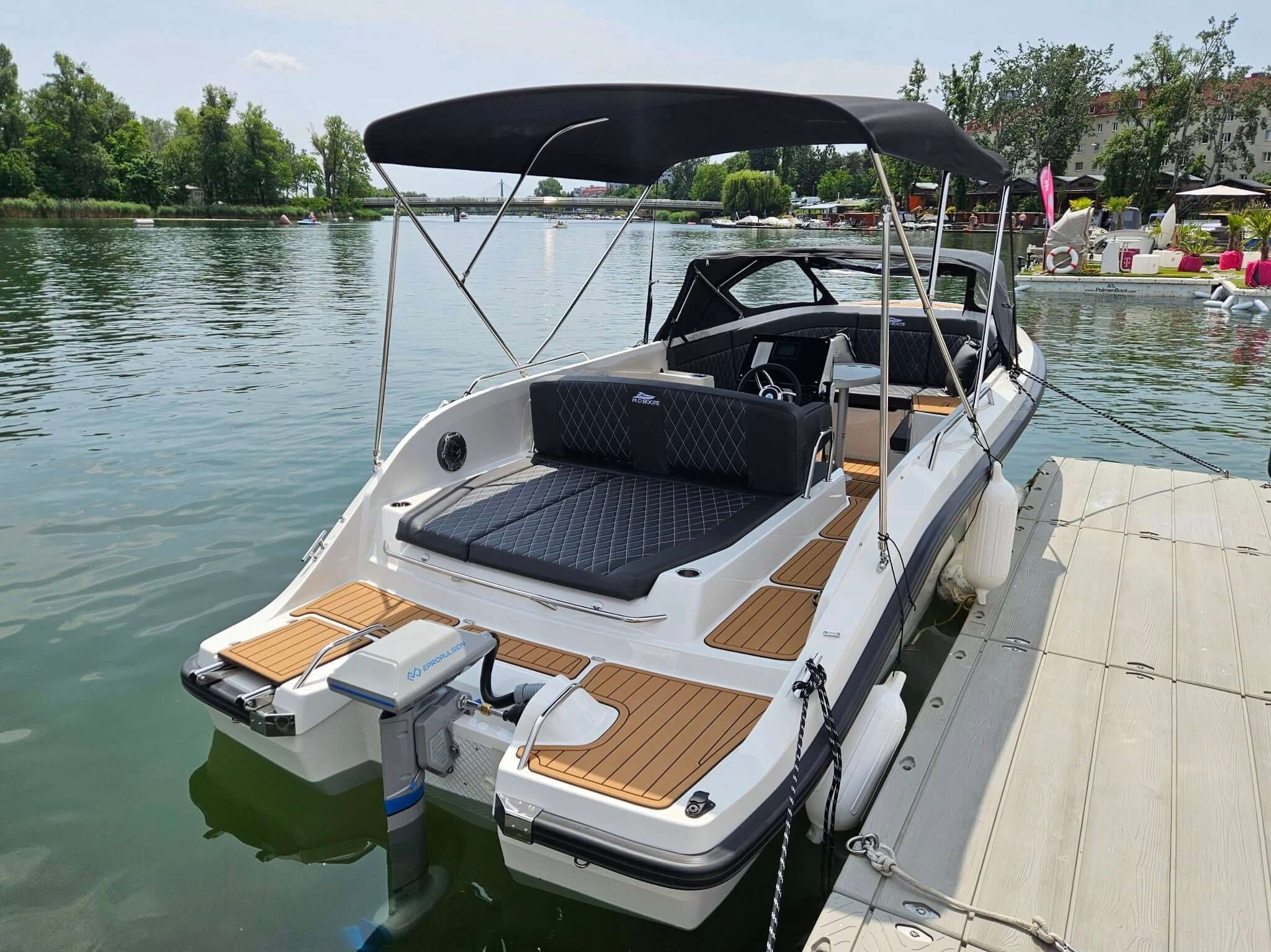 Selbstlenzendes Cockpit, Cockpitpolsterung, Kabinenpolsterung, Belüftungssystem, automatische Bilgenpumpe, Ankerrolle, Badeleiter, Standard – Polstern aus Kunstleder, Ankerkasten, Vorderer Teil als Sonnenliege, Lenkung mit Edelstahl-Lenkrad, Hecksitzbank mit Sitz- und Rückenpolster, Edelstahl Reling und Beschläge.